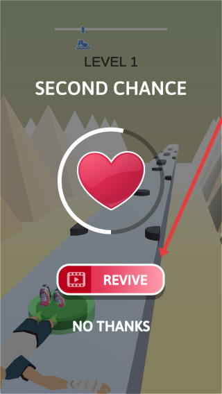 3、若失败,在“SECOND-CHANCE”界面选【REVIVE】复活(观看广告),或点【NO-THANKS】重开,继续挑战,刷新关卡成绩。