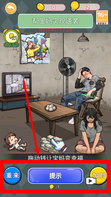 2.关卡操作区:界面底部设有“重来”、“提示”与“加时”三种功能按钮,可在卡关时消耗金币获得线索提示,也可透过观看广告延长关卡时间。