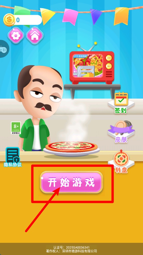 1.开始游戏入口:在主页面点击“开始游戏”按钮即可正式进入披萨制作流程,准备好就可以马上体验动手的乐趣。