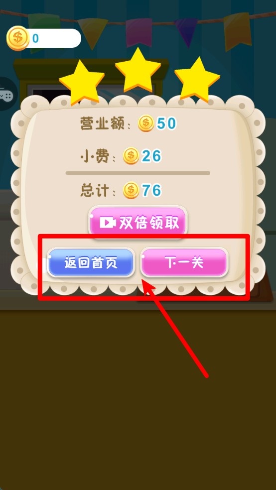 3.关卡结算页面:完成制作后会显示营业额和奖励,点击“下一关”可继续挑战更多关卡并获得更多金币收入。