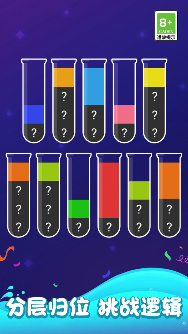 1.液体分类挑战:菜到极致将色彩液体排序与益智解谜完美融合,玩家需通过清晰逻辑思维将同色液体精准地分类。