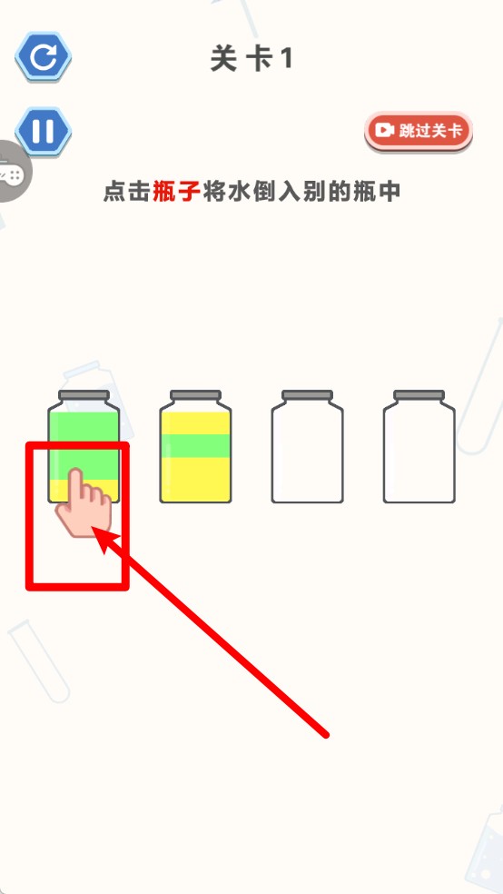 2.点击试管倒液:轻触任意瓶子即可将液体倒入其他空瓶,确保颜色一致才能继续,操作简单却很烧脑。
