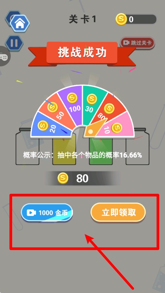 3.挑战成功奖励界面:通关后可获得金币奖励,点击“立即领取”或观看视频获取更多金币,记得别漏领超划算!