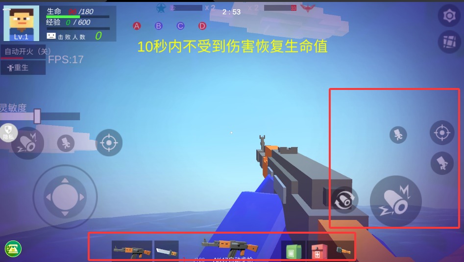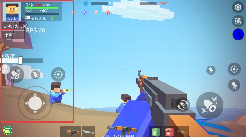 2、游戏界面左侧分布着角色生命值条、自动射击开关、灵敏度调节以及移动摇杆和瞄准按钮等核心操作功能。