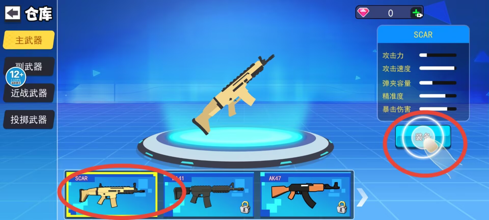 1、通过仓库界面选择主武器分类,点击已解锁枪械后在右侧面板确认装备选项完成武器配置。