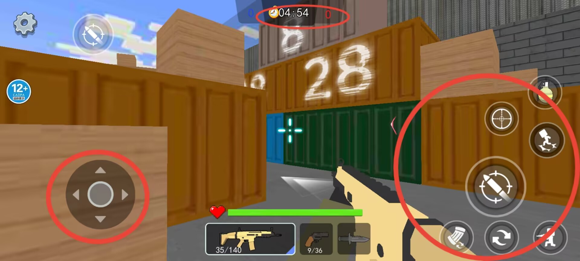2、游戏界面顶部显示关卡倒计时与击杀统计,底部区域包含移动控制与战术动作功能按钮及生命值状态。