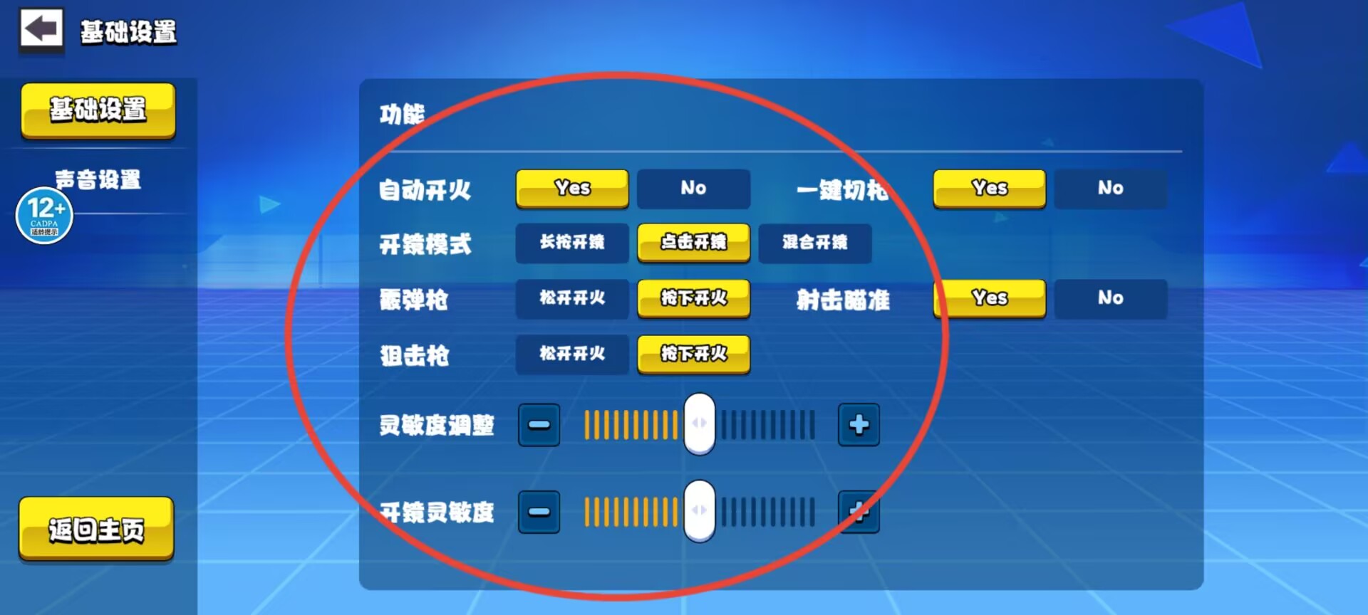 3、设置菜单提供自动射击、快速切枪、瞄准模式及操作灵敏度等多项参数的自定义调整功能。