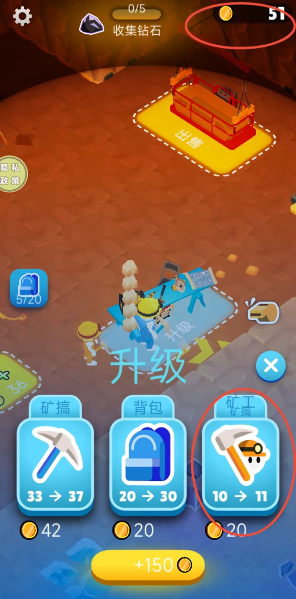 1、前往地图指定升级区域,在弹出界面中选择矿工升级选项,消耗金币可提升角色等级,同时支持矿镐与背包容量强化。