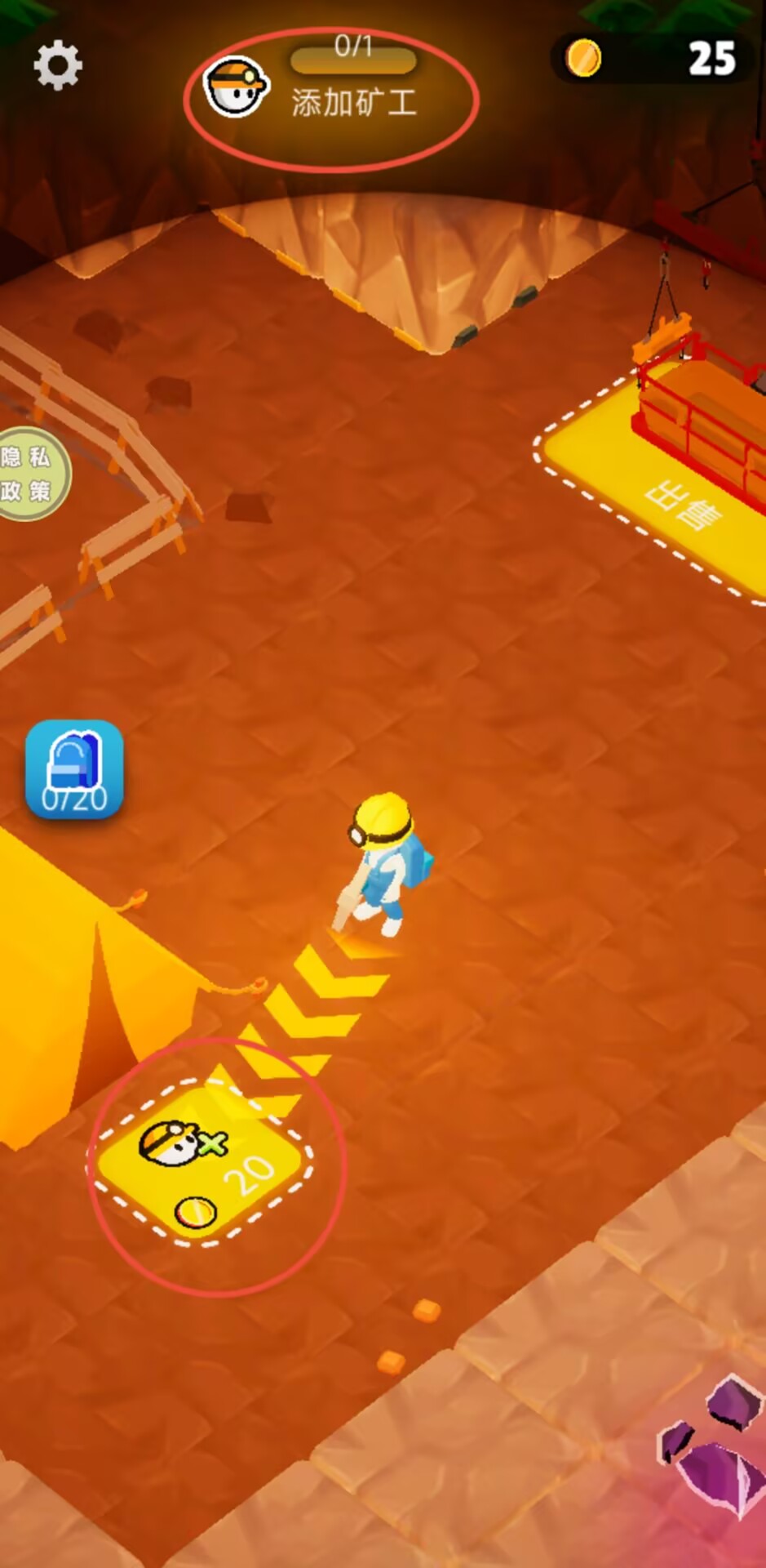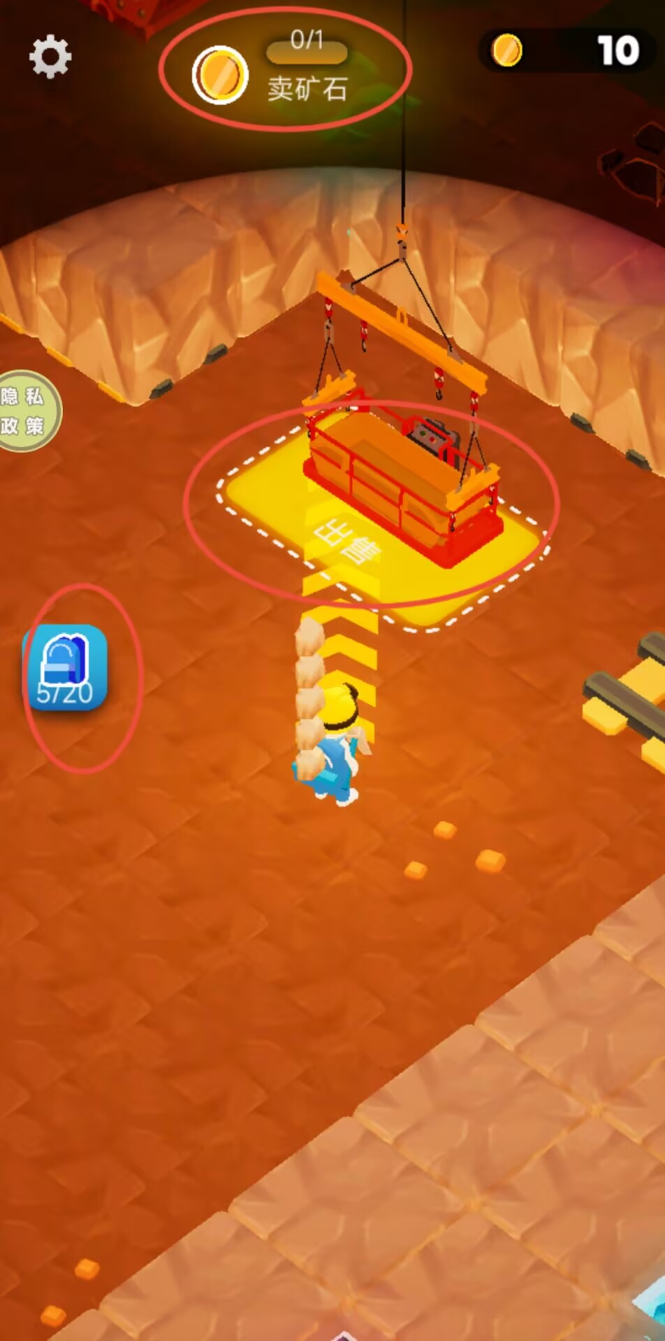2、界面顶部实时显示当前任务目标及完成进度,矿工接触矿石自动采集,资源存入背包后可前往交易区兑换金币。