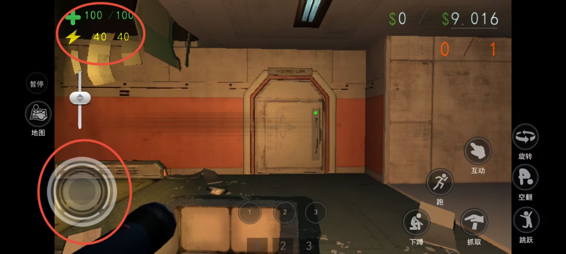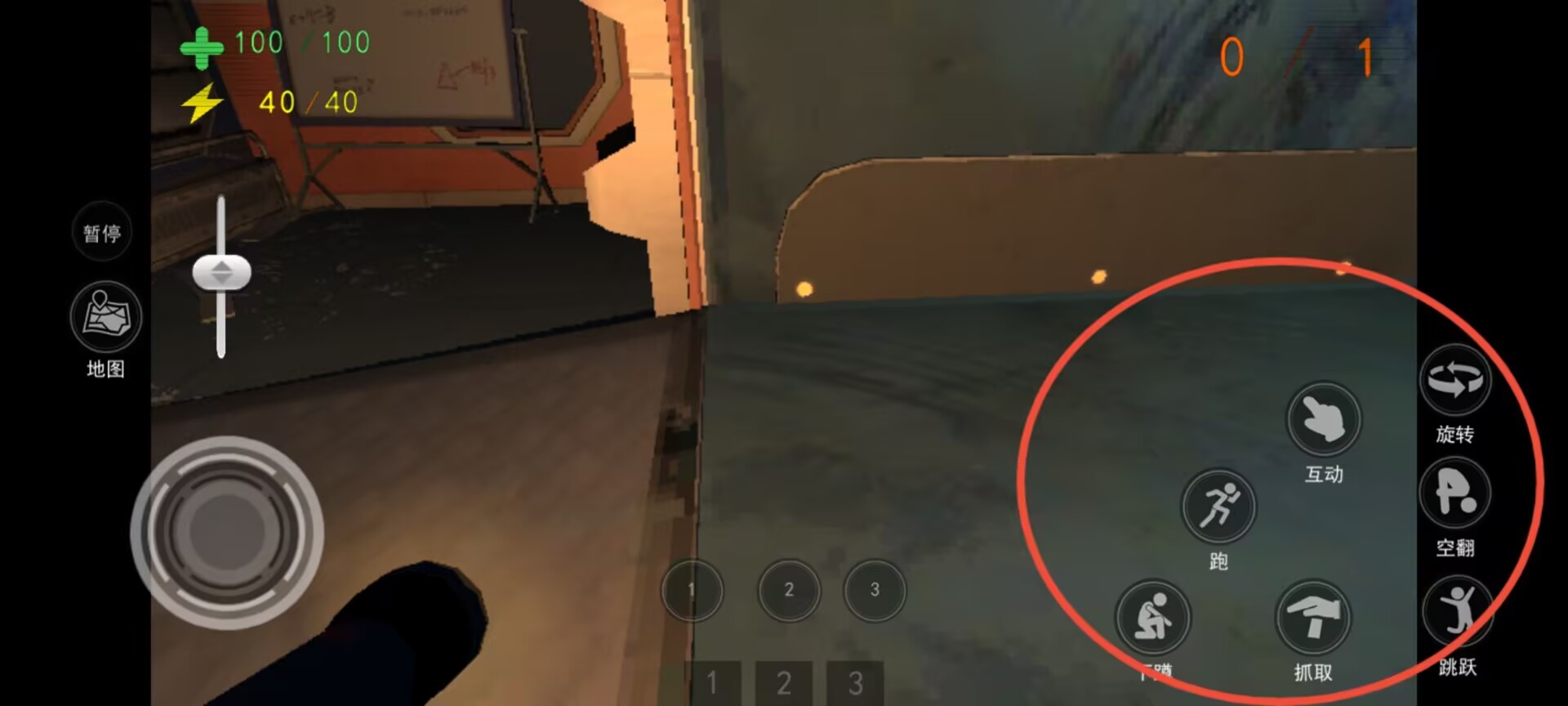 3、屏幕右下角排列着七项动作指令按钮,分别对应转向、翻滚、弹跳、交互、拾取、冲刺及蹲伏等基础操作功能。
