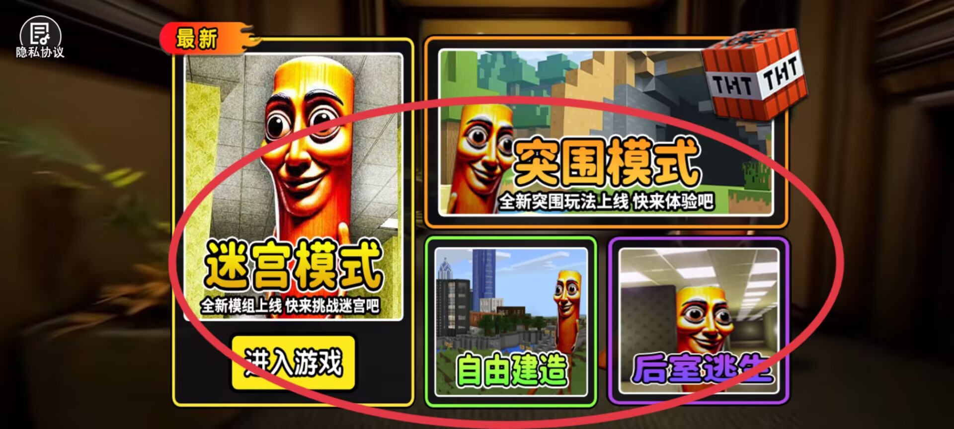 1、游戏主界面提供四种游玩模式选项,包含迷宫探索、突围挑战、自由建造及后室逃生等不同玩法类型。