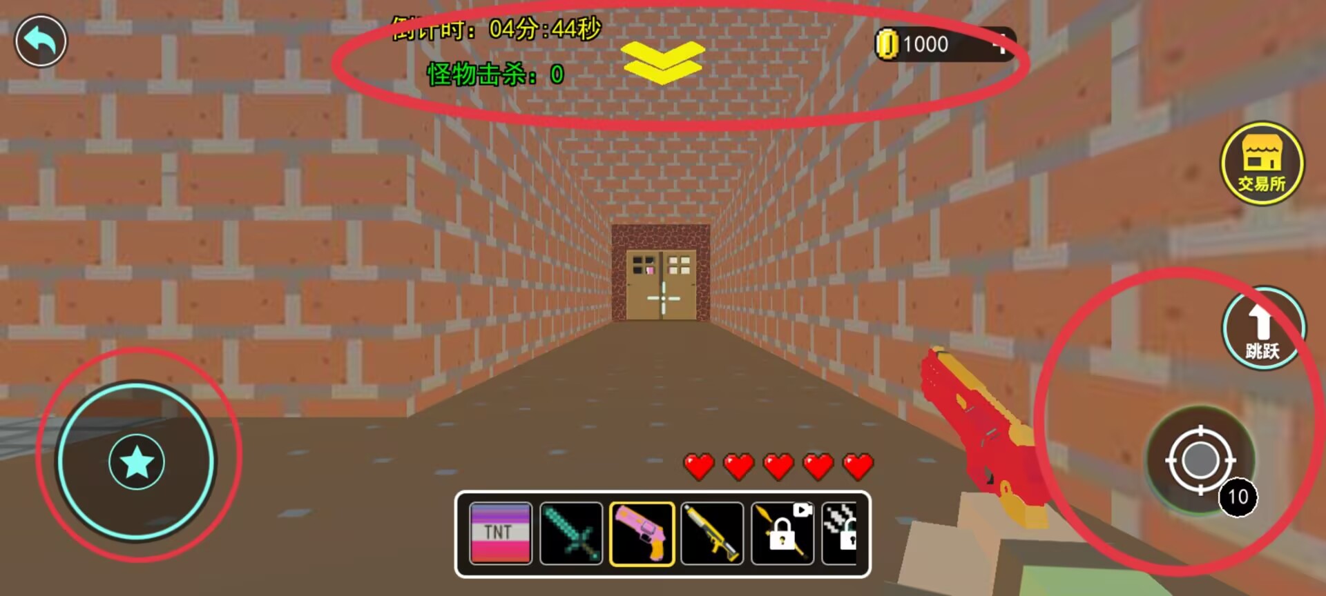 2、界面顶部区域显示任务剩余时间、击败怪物数量及持有金币数,左下角配置移动控制,底部集成武器切换与生命状态显示。