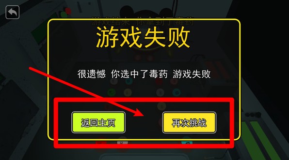 3.失败提示界面:若玩家不慎选择到对方设下的毒药,系统将弹出失败画面并提供重新挑战或返回主页的选项。