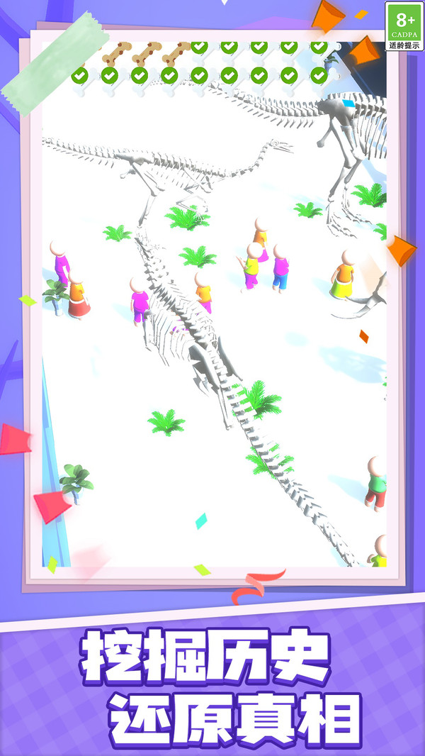 2.拼图式成就感:将每个零碎化石精准拼接成完整恐龙模型,每次成功复原都极具成就与满足感,玩家还能收集不同种类的史前巨兽。