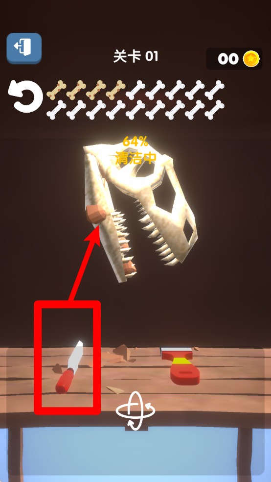 3.化石清理操作:进入化石处理区后,使用小刀或工具清理附着泥土,将骨骼逐步还原,完成率实时显示。