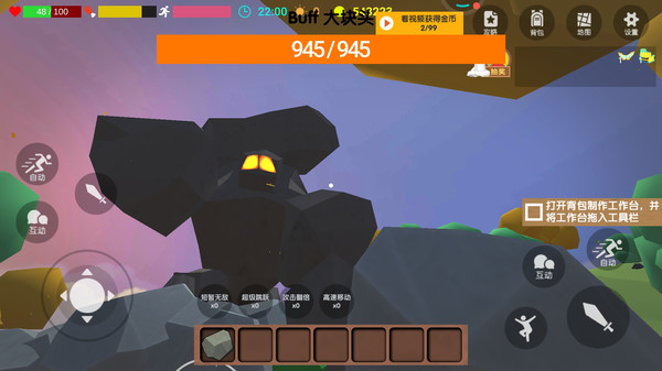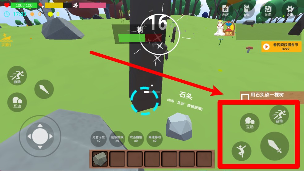 3.采集攻击机制:通过右侧按钮发动攻击、互动或跳跃,玩家可用石头敲树采集材料,为生存打好基础。