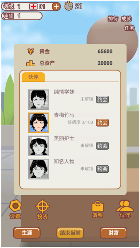 3、情感培养系统丰富,10+位各具特色的可攻略角色,通过送礼、约会提升好感度,美满婚姻能带来事业加成,但也要小心拜金女。