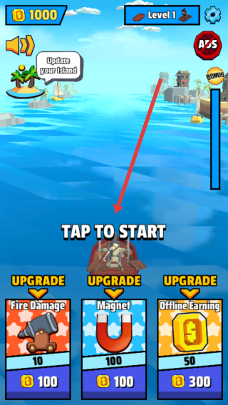 1、点击【TAP-TO-START】,开启海上冒险,可先升级(如Magnet、Fire-Damage),增强船只战斗能力。