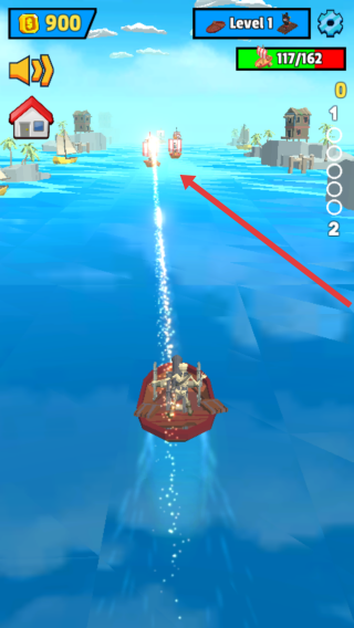 2、航行中,操控船只瞄准箭头指向的目标(敌方船只),发射炮弹,躲避攻击,争取战斗胜利。