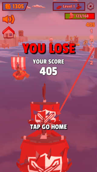 3、失败后,点击【TAP-GO-HOME】返回主页,利用得分(405)升级,重新挑战,提升游戏进度。