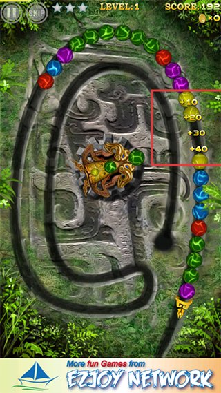 2、瞄准轨道上的彩色珠子发射弹珠,匹配三个同色即可消除,注意珠子滑行速度变化。