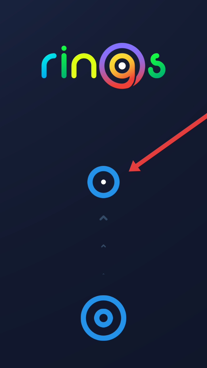 1、进入Rings的游戏界面,需要点击箭头指向的蓝色圆环图标,开启颜色匹配的游戏旅程。