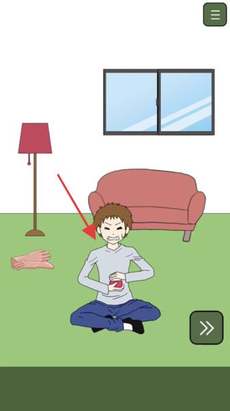 1、在客厅场景中,观察人物与周围物品(如断手、人物抱胸姿态),点击右下角箭头推进剧情,尝试与场景互动,解开人物痛苦抱胸的原因,推动故事发展。