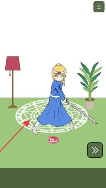 2、进入新场景,看到持剑角色与魔法阵、物品,点击右下角箭头,探索场景互动点,像点击持剑角色,触发战斗或技能演示,解锁新剧情分支。