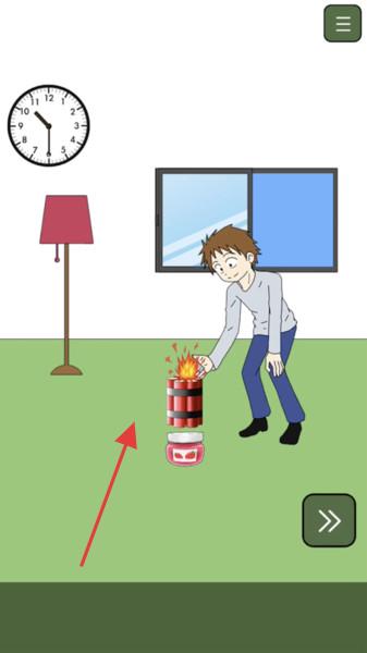 3、面对点燃的炸药场景,观察时钟、人物与炸药的关联,点击右下角箭头,快速做出反应,比如移动人物远离炸药,利用时间机制(时钟倒计时),在爆炸前完成操作,改变结局。