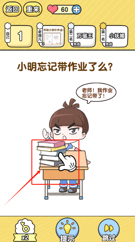 1、点击提示按钮寻找线索,判断小明是不是真的忘带作业,注意不要用完60颗爱心(爱心可用于获取提示或弥补错误)。