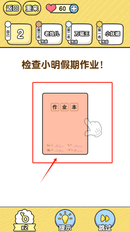 3、查看小明乱写的作业,找出所有错题,若当前题目难以判断,可点击“跳过”按钮换下一题,避免浪费时间。