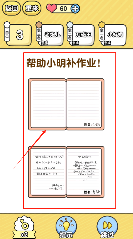 2、用红圈标记出作业本里的问题,点击“x2”按钮可获得双倍分数,若标记错误,点击“重来”按钮重新检查。