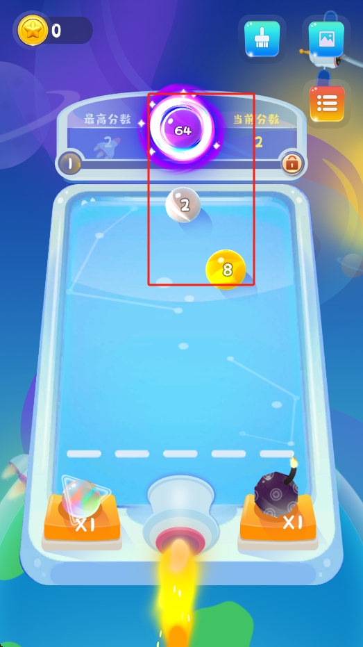 2、游玩过程中发射星球进行合并消除,将相同数字的星球组合使其数值变大,同时避开白色方块,朝着合成2048星球的目标前进。