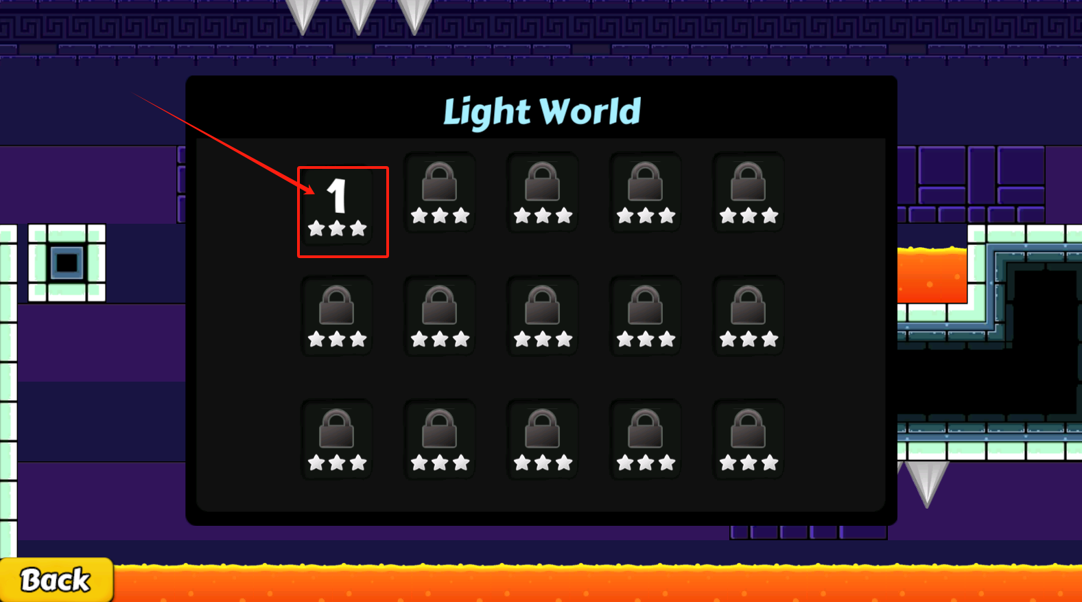 2、选择红框标出的第1关开始游玩,处于锁定状态的关卡需要完成前置关卡才能解锁,点击“Back”可返回上一级界面。
