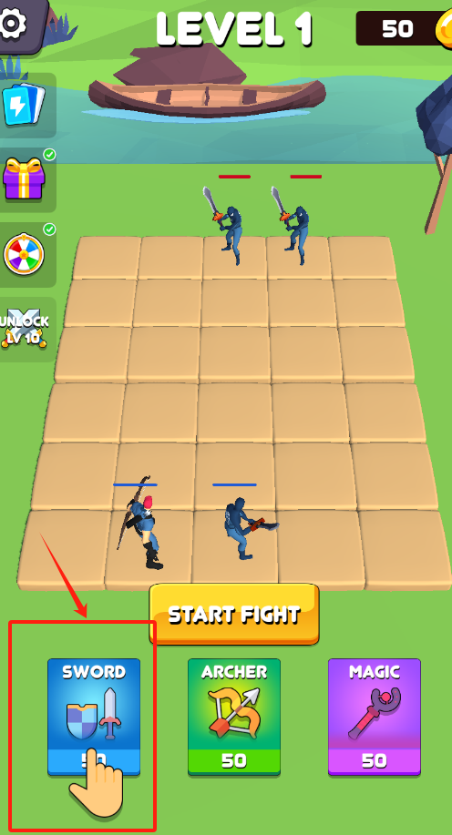 1、点击红框里的剑士按钮选择角色,再按下方面的绿色“START FIGHT”按钮,即可开始第一关战斗。