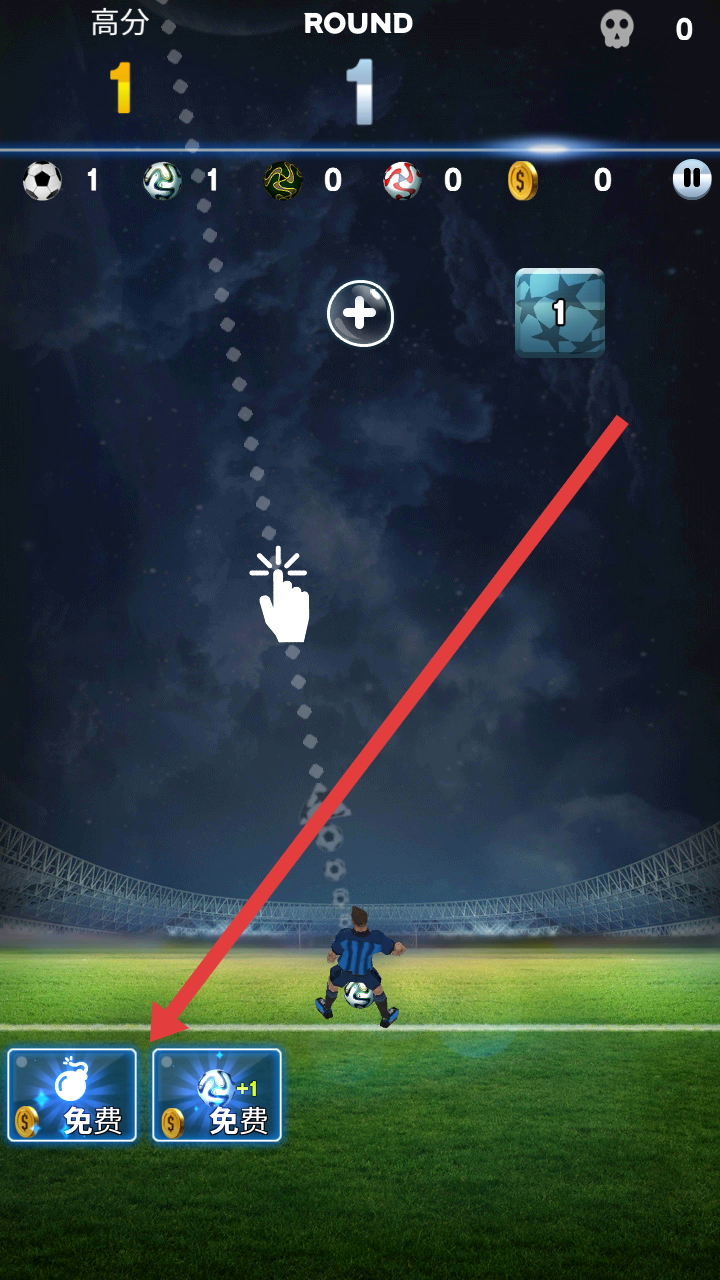 2、在足球打砖块的游戏内,需要点击底部免费道具,辅助规划足球弹射轨迹,提升击球策略性。