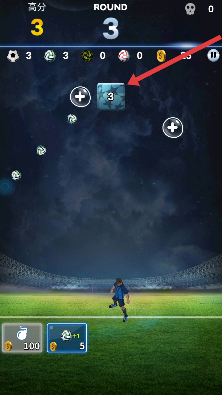 3、操控者需要操控足球来进行撞击空中带数字的方块,通过弹射积累分数,推进ROUND回合进度。