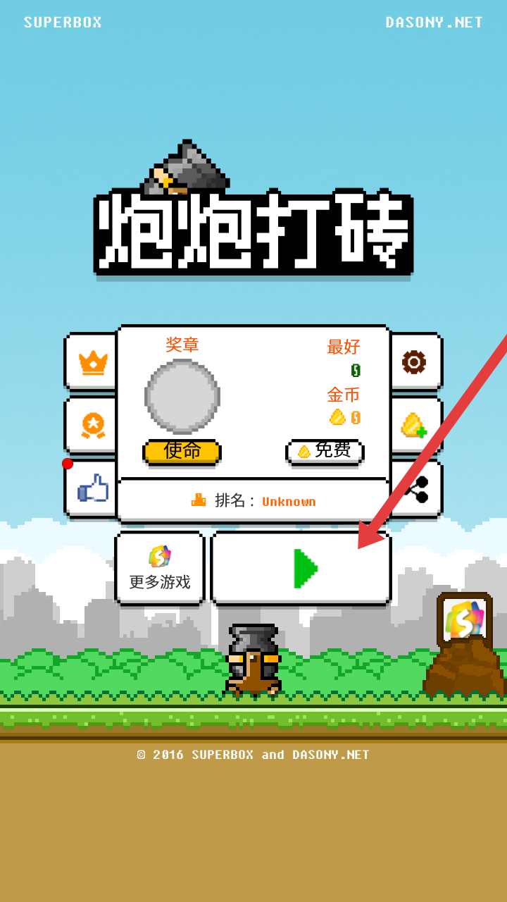 1、进入炮炮打砖的游戏主界面后,操控者需要点击绿色三角的【开始按钮】,开启打砖冒险。