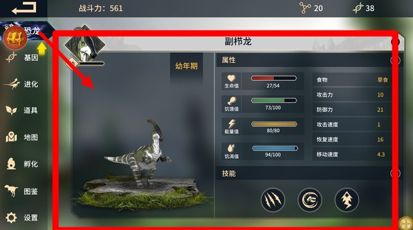 2.恐龙属性界面:点击左侧恐龙图像可查看属性详情,包含攻击、防御、速度等数据,方便进行战斗准备。