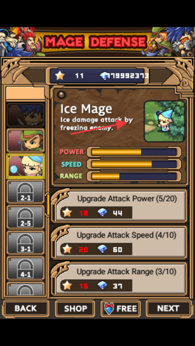 2、“升级英雄”,进入角色界面,消耗星星、钻石,升级法师(攻击、速度、范围),增强战力。