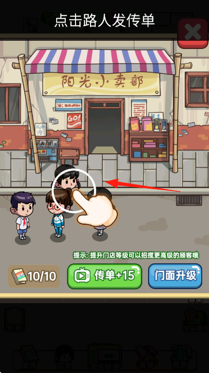 2、在阳光小卖部前,点击路人发传单如箭头指向的女孩,提升店铺人气。