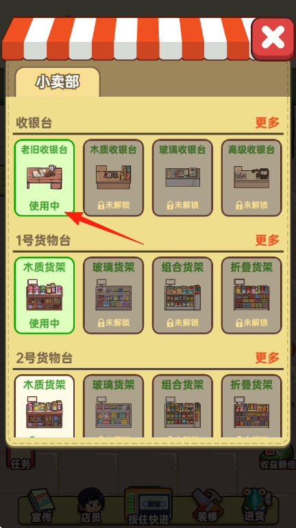 3、进入装修界面,优先使用“老旧收银台”“木质货架”,积累资源后解锁高级设施,优化店铺布局。