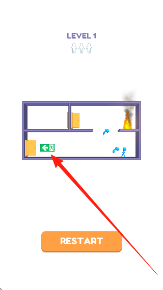 2、在LEVEL1火灾场景,蓝色小人面临火焰威胁,要快速引导小人,绕开火焰,冲向绿色逃生标识,关注火势蔓延,规划最短、最安全路径,让小人逃离火场。