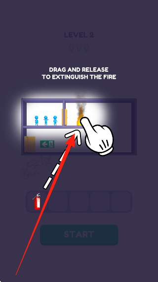 3、来到灭火关卡,看到火焰与蓝色小人,按住灭火器,拖动瞄准火焰方向,松开释放灭火剂灭火,需精准操作,先灭火再引导小人逃生,体验灭火与逃生结合的玩法。