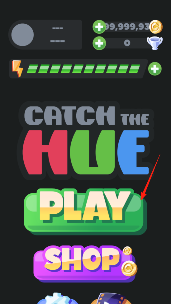 1、进入“Catch The Hue”主界面,点击“PLAY”开启色彩挑战,界面显示货币、道具等资源,玩家通过参与色彩关卡,积累分数解锁奖励,利用资源提升游戏体验。
