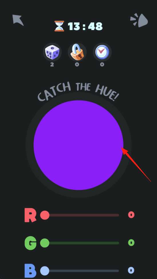 3、进入色彩捕捉关卡,界面有紫色大圆与RGB滑块,玩家需调整R、G、B数值,让大圆色彩符合目标色调(通过任务提示),在限时(13:48)内完成色彩匹配。