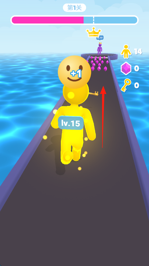 1、操控绿色人群沿箭头跑酷,吸收“+1”小人壮大队伍,避开火焰障碍,提升等级(Lv.5→Lv.15)。