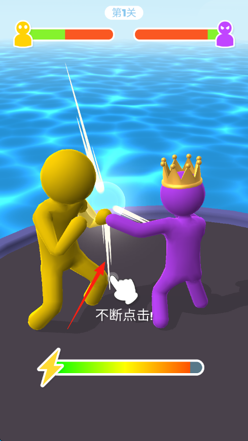 3、在擂台,对紫色皇冠boss不断点击屏幕出拳,依据下方能量条调整节奏,击败对手通关。