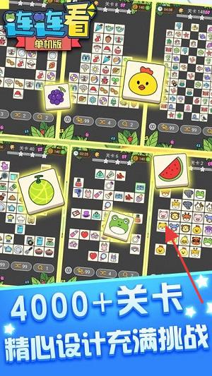 2、来到关卡选择界面,4000+关卡按主题分类,点击心仪关卡,进入对应图案布局(如水果、动物)的棋盘,每关需快速识别可连接的相同图标,用最短路径、最少步数消除。