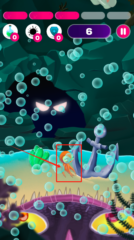 1、点击红框里的橙色章鱼控制它游动,注意避开上方的黑影怪物,界面显示的数字6代表剩余生命,生命耗尽则游戏失败。